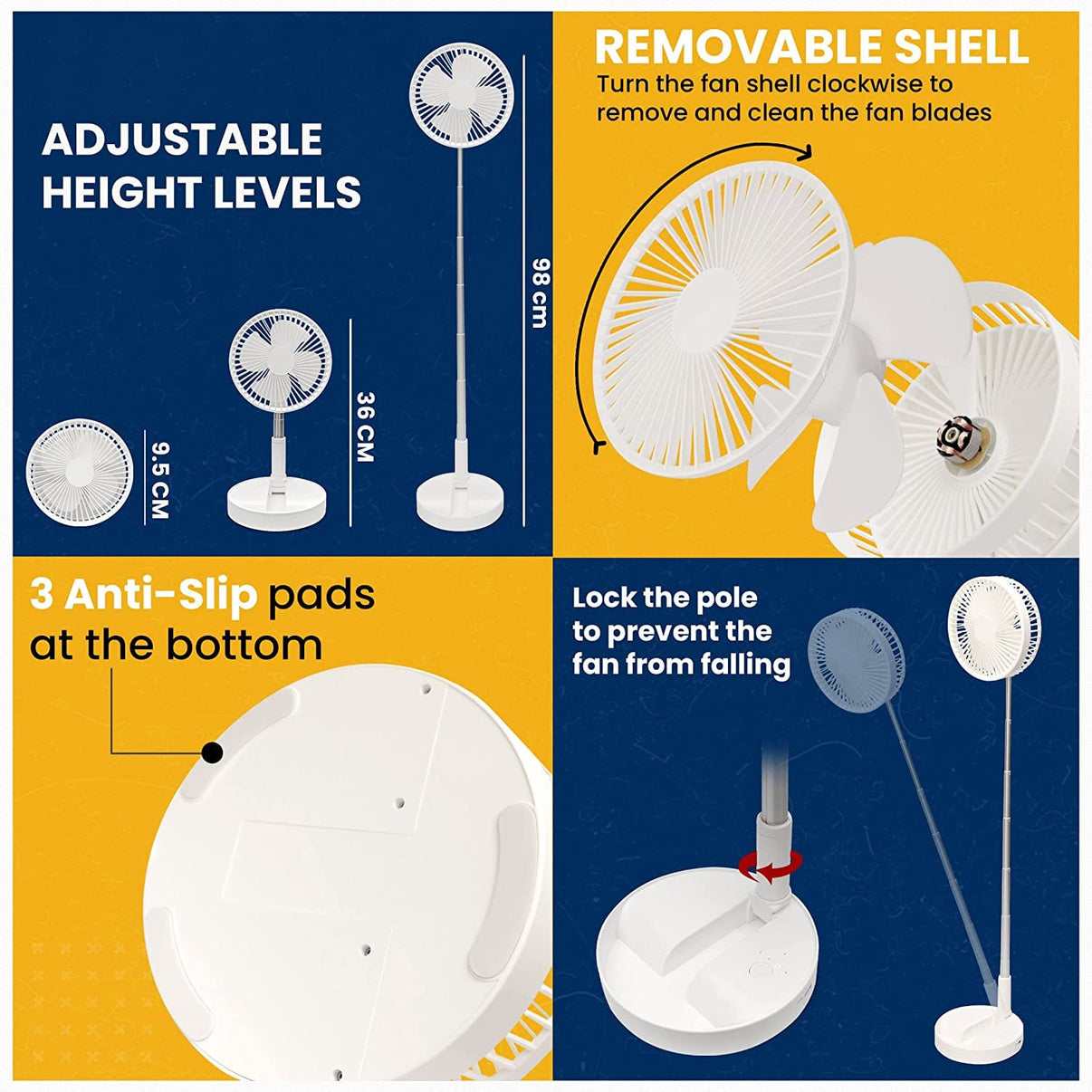 Equipped with a robust rechargeable battery, this table fan provides a reliable 6 to 7 hours of continuous cooling power on a single charge. No more worrying about finding power outlets or dealing with cumbersome cords. Simply charge it up, and enjoy uninterrupted breezes wherever you need them. Plus, with its foldable design, storing and transporting this fan is a breeze, making it ideal for travelers, campers, and anyone on the move.